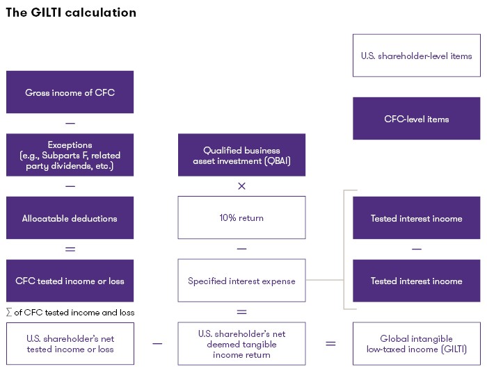 For tax years beginning after 2017, U.S. shareholders of a CFC are subject to current U.S. tax on its GILTI inclusion. GILTI is generally defined as the excess of a U.S. shareholder’s aggregated “net tested income” from CFCs over a routine return on certain qualified tangible assets. This aggregated approach allows loss entities to offset other entities with tested income within the group, but not below zero.