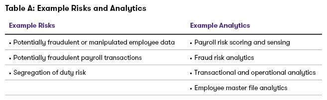 - Develop audit and compliance monitoring. Automated controls and monitoring can be used to identify and monitor key risks and controls. See Table A for example risks and analytics.