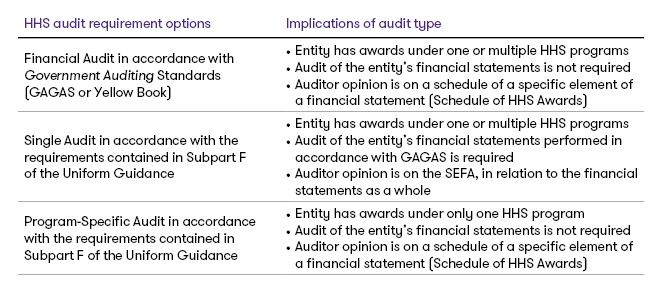 For-profit recipients that expend $750,000 or more of HHS awards, including PRF funds, during their fiscal year can elect one of the three options outlined in the table below to meet HHS audit requirements. Unless specifically excluded, all HHS awards are subject to the HHS for-profit audit requirements.