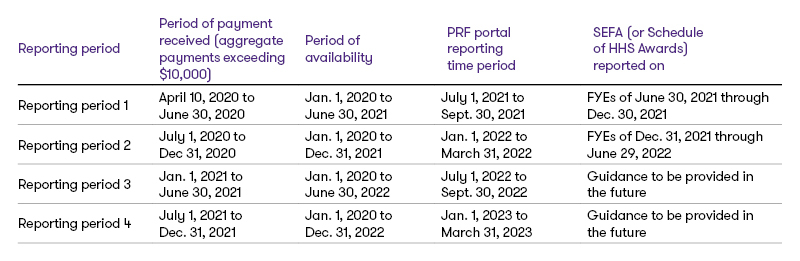 In October 2021, HRSA also announced a 60-day reporting grace period for both non-federal and for-profit recipients of PRF funding, with a submission deadline of Sept. 30, 2021 (Reporting Period 1). The deadline itself was not changed, and late reports will be considered out of compliance; however, a failure to meet the Reporting Period 1 deadline will not result in enforcement actions or single audit findings if entities are brought into compliance by the end of the grace period on Nov. 30, 2021. Deadlines for Reporting Periods 2-4 outlined in the Appendix were unchanged.