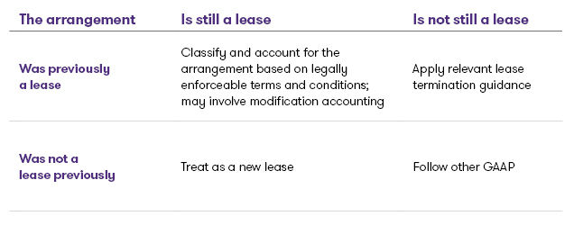 If the entities in the arrangement cease to be under common control, the accounting would depend on whether (1) the arrangement was a lease when the entities were under common control, and (2) the arrangement is a lease now that the entities are no longer under common control, as shown in the following table.