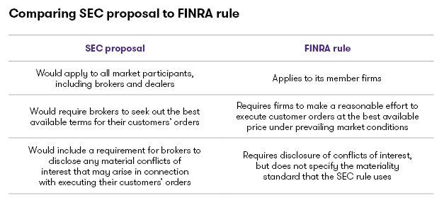 The SEC proposal would join a FINRA rule in requiring brokers to disclose information about the routing and execution of their customers' orders. However, the specific disclosure requirements would differ between the two. We highlight some of these below:
