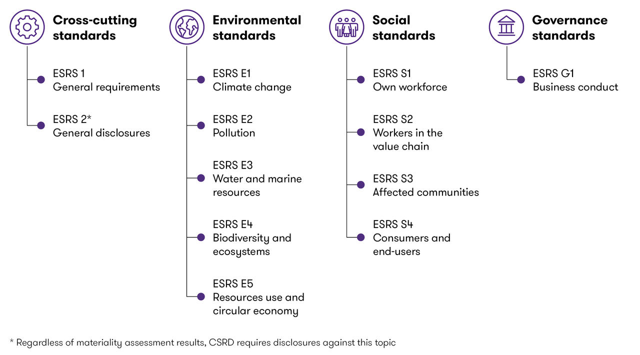 The CSRD directs the European Financial Reporting Advisory Group (EFRAG) to establish a reporting framework called the European Sustainability Reporting Standards (ESRS). The draft framework includes general, cross-cutting requirements applicable to all in-scope companies and topical disclosures that may or may not be material to a company. Below is a summary of the currently available draft standards: