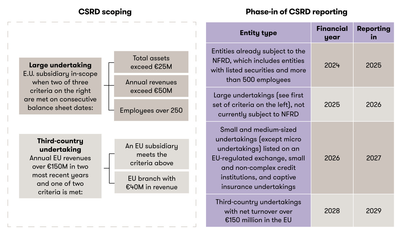 - 2025: The EU-based parent of a group of entities that meet the large undertaking criteria as a whole, including certain accommodations for consolidated or combined reporting