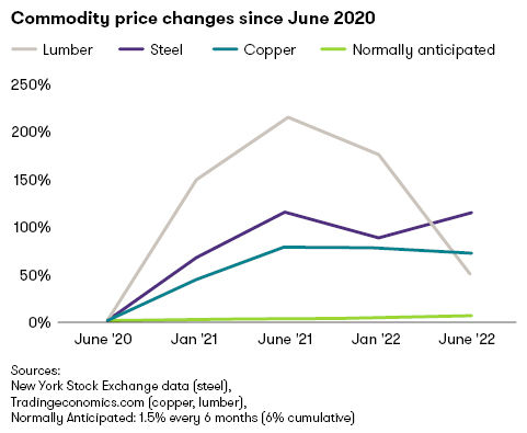 For example, on March 18, 2020, the NYSE reported that steel sold for $539.40 a ton. Barely two years later, on April 12, 2022, it was $2,039.58. Similarly, the NASDAQ priced copper at $2.3155 per pound on March 17, 2020. It soared to $4.738 per pound on April 6, 2022. The following chart summarizes the percentage increase for steel, lumber, and copper from June 2020 until June 2022.