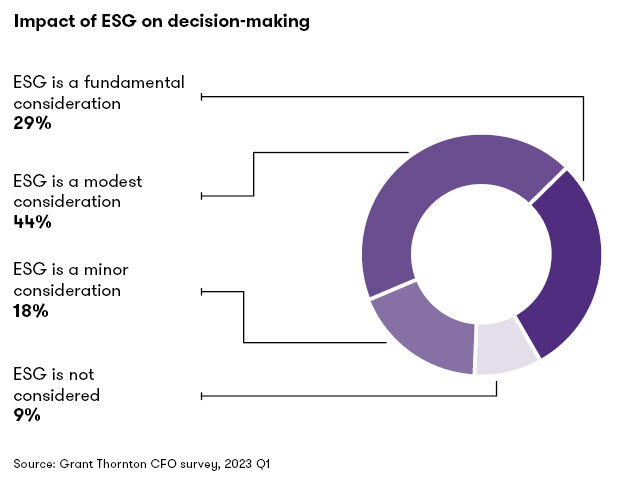 Meanwhile, the desires of executive management (44%) and employees (43%) are the top factors motivating finance leaders to take action on ESG. Members of Grant Thornton’s ESG practice say it’s important to remember that any action on ESG will appeal to multiple stakeholder groups at the same time, particularly younger people who have the potential to be employees as well as customers in a labor market that remains tight in some industries.