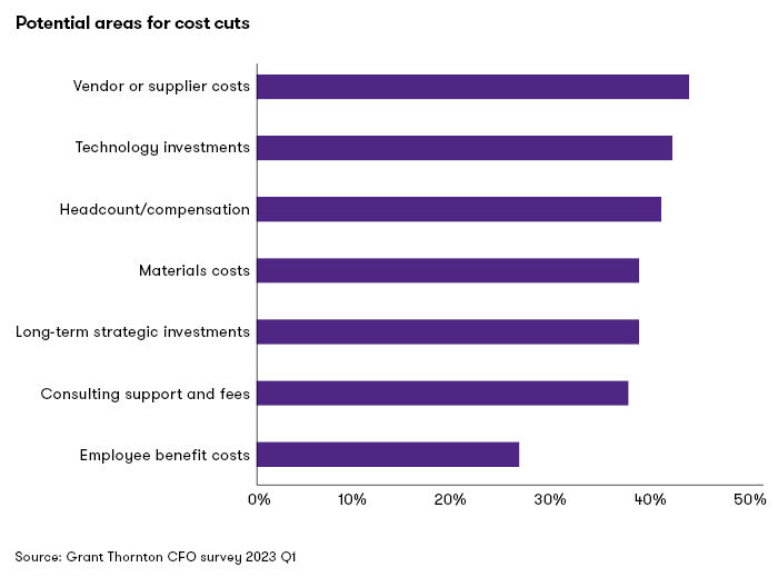 What might CFOs be looking to cut? Technology spending experienced a double-digit increase as an area for possible cuts. Vendor and supplier costs were the top area of potential cuts for CFOs, and materials costs saw a double-digit rise as an area for cost cuts compared with six months ago, perhaps because supply chain woes are easing.