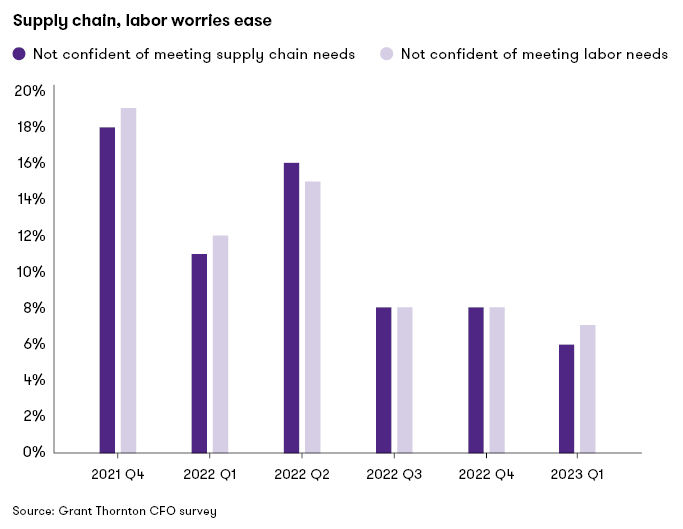 The latest CFO survey shows that those challenges are easing slightly. For the first time since the second quarter of 2022, finance leaders did not rate supply chain as their biggest challenge.